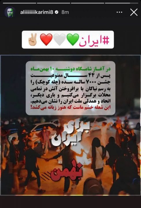 علی کریمی که یکی از فعال‌ترین لیدرهای اغتشاشات اخیر بود، به تازگی در صفحه اینستاگرام خود برای احیای جسد بی‌جان اغتشاشات از جشن سده برای فراخواندن مردم به آشوب‌های خیابانی استفاده کرده که فراخوانی سراسر دروغ و تحریف است.