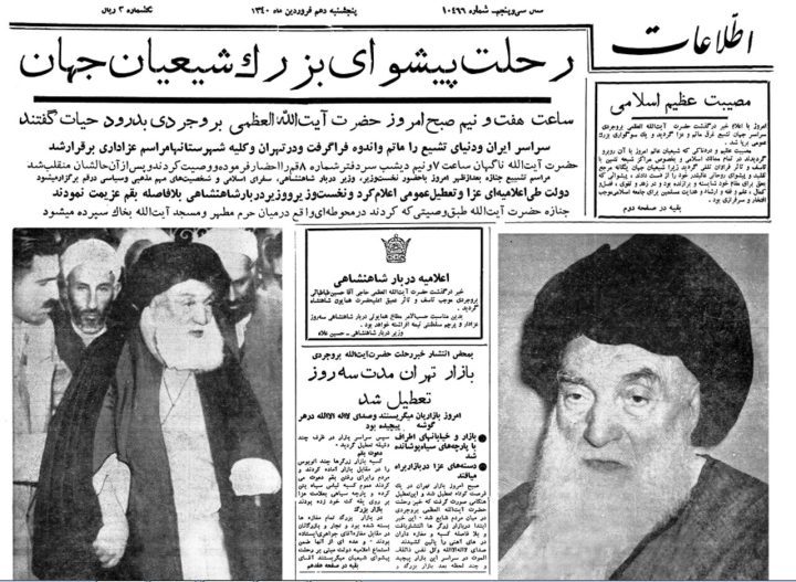 خبر درگذشت حضرت آیت‌الله العظمی حاجی آقای حسین طباطبایی بروجردی موجب تاسف و تاثر عمیق اعلیحضرت همایون شاهنشاه گرید. بدین مناسبت حسب‌الامر مطاع همایونی دربار شاهنشاهی سه روز عزاداری و پرچم سلطنتی نیمه افراشته خواهد بود. وزیر دربار شاهنشاهی – حسین علاء (اطلاعات؛ ۱۰ فروردین ۴۰)