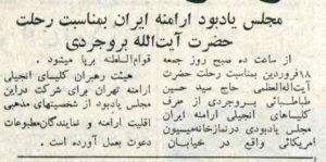 کلیسای انجیلی ارامنه‌ی ایران نیز روز جمعه ۱۸ فروردین ۱۳۴۰، هشت روز پس از درگذشت آیت‌الله بروجردی مجلس یادبودی را در نمازخانه‌ی میسیون آمریکایی واقع در خیابان قوام‌السلطنه‌،۳۰ تیر کنونی، برگزار کردند در این مراسم از شخصیت‌های مذهبی ارامنه و نمایندگان مطبوعات دعوت به عمل آمده بود.